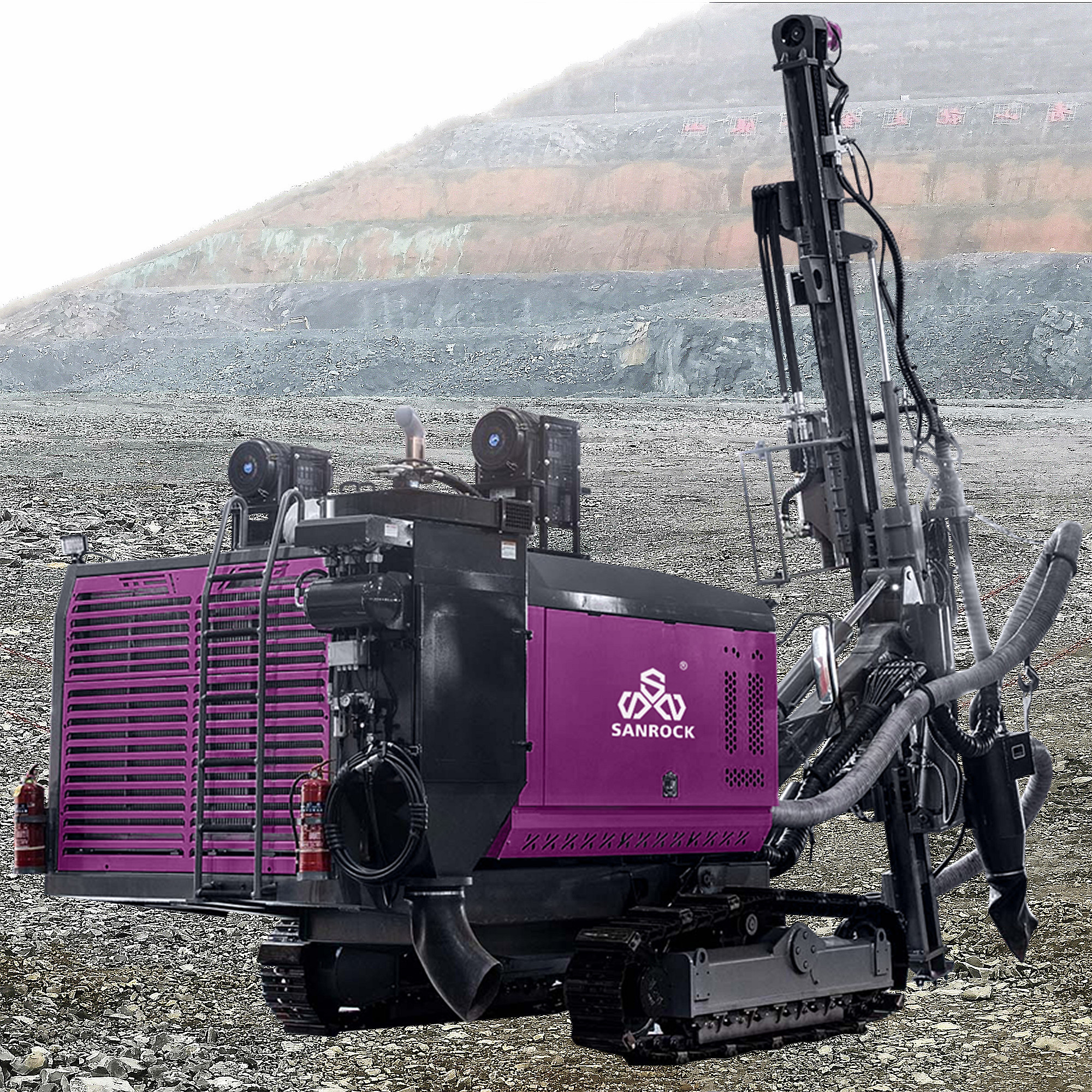 The drilling rig is characterized by excellent integrity and compact design structure. Optional installation of automatic rod change,configuration dry dust collectors environmental protection. High degree of automation, efficient drilling, simple operation, flexible maneuverability, single operator for labor cost. Sanrock automatic drilling rig with rod changing system, powerful feeding and rotation design for less jamming in complex rock situation,hefficient High efficiency drilling speed. Can easily cope with all kinds of drilling angel requirement of landscapes. The advantageous functions such as precise boom positioning,automatic rod handling.